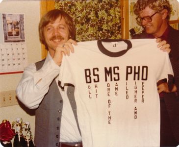 I loved teaching, and I had the opportunity not only to teach introductory psychology (the science, not the self-help stuff, something the business school said I was inflicting on their students), but upper division courses in human factors and organizational psychology. I even had some master's students whom I directed. And, I was able to complete my dissertation and receive my PhD. The photo above says it all.
